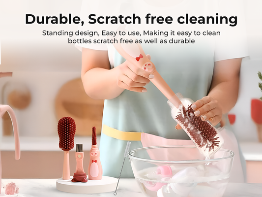 Elevate your bottle cleaning routine with the tütots 4 in 1 premium silicone bottle brush set. This versatile bottle cleaner brush is designed to cater to all your needs with its innovative design featuring four distinct brushes: a Nipple Straw Brush, Lid Brush, Bottle Brush, and Straw Brush. Crafted from high-quality silicone, each brush is equipped with thick bristles that offer exceptional efficiency in reaching narrow spaces, ensuring a spotless clean every time. Thanks to its compact build, it occupies minimal space, leaving your kitchen clutter-free and organized. The tütots baby bottle cleaner brush is the perfect solution for busy parents seeking a safe and thorough cleaning option. Whether you're washing baby bottles, nipples, or lid crevices, this set ensures every corner is meticulously scrubbed, providing a hygienic feeding experience for your little one. The durable silicone bristles are gentle yet effective, making it an ideal feeder brush cleaner for everyday use. Moreover, the integration of multiple cleaning heads means you can tackle various sizes of baby bottle elements without needing separate tools, streamlining your cleaning process. Join countless others who have upgraded their cleaning arsenal with the tütots baby bottle brush cleaner. By combining innovative design with premium materials, this bottle brush cleaner for feeding bottles not only enhances the cleaning effectiveness but also adds value to your daily routine. Perfect for cleaning, storing, and maintaining, it promises to make bottle cleaning a breeze, so you can devote more time to doing things you love. Make the smart choice with tütots and experience a cleaner, safer way to care for your family's needs.