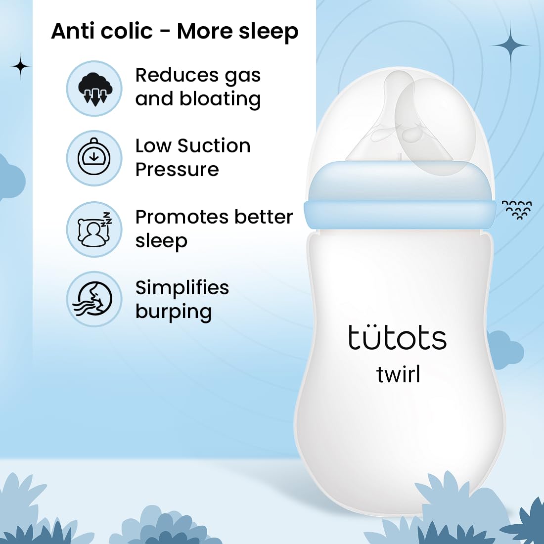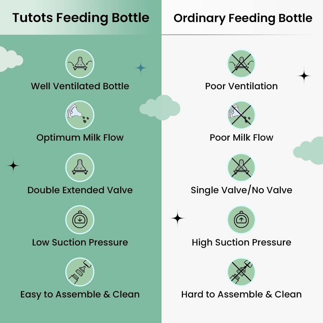 • Anti-Colic Design - Our tütots Feeding Baby Bottle features an advanced anti-colic system that reduces air intake, ensuring a comfortable feeding experience for your baby and minimizing the risk of colic.