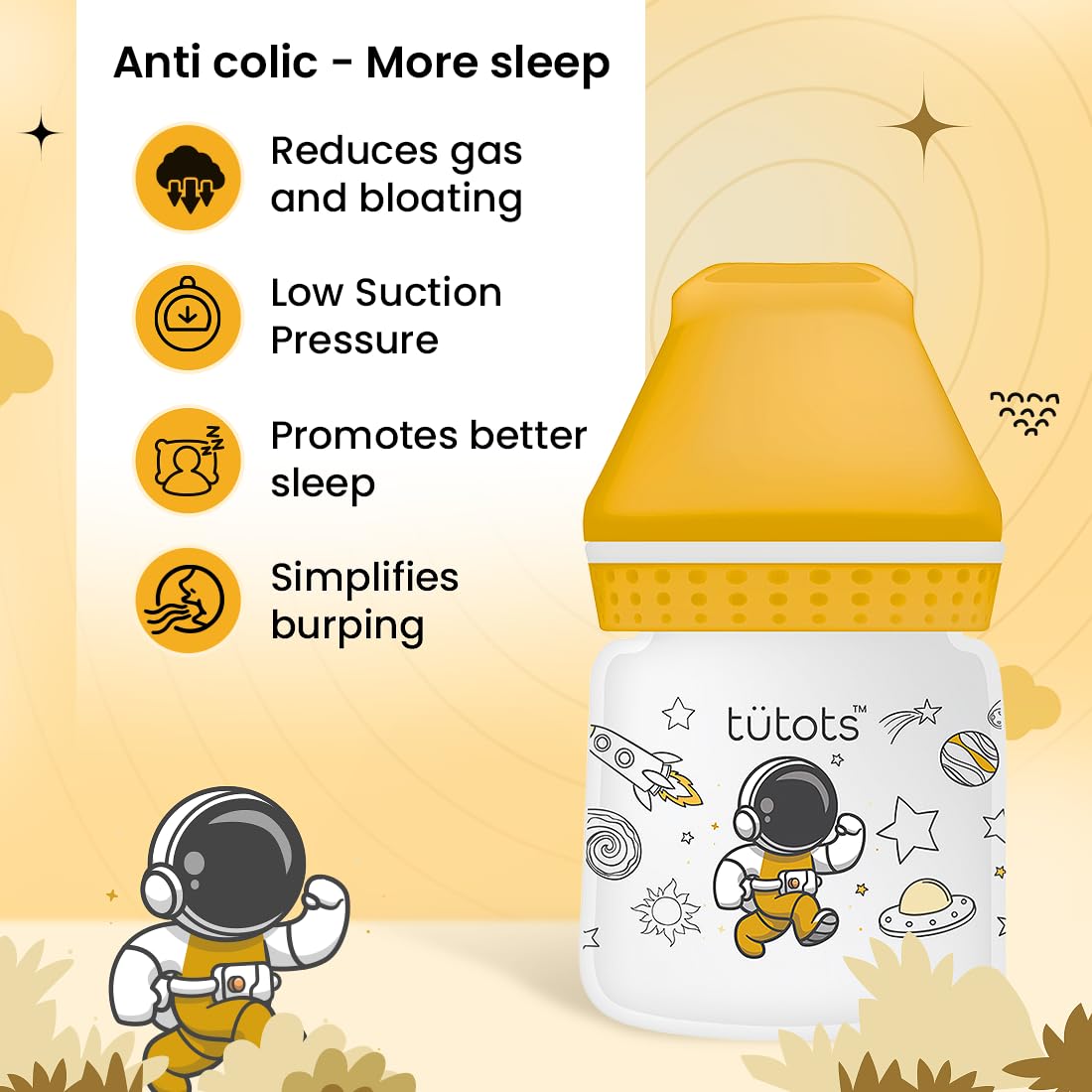 - Colic-Free Comfort: Enhance your baby's feeding experience with the tütots Instinct AntiColic Wide Neck feeding bottle. Designed with an advanced Turbo Vent Nipple, it reduces colic and gas, ensuring a smooth and comforting feed; your little one stays happy and content without the discomfort of air ingestion. Perfect for new borns, it delivers a nurturing and peaceful feeding time. Ensure your baby's well-being with each bottle.